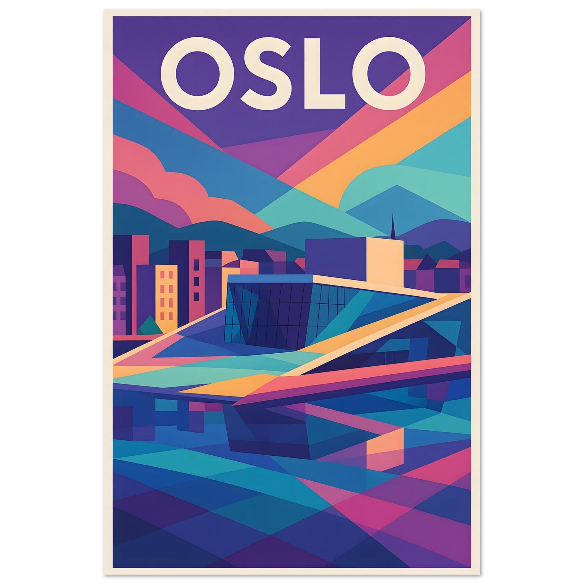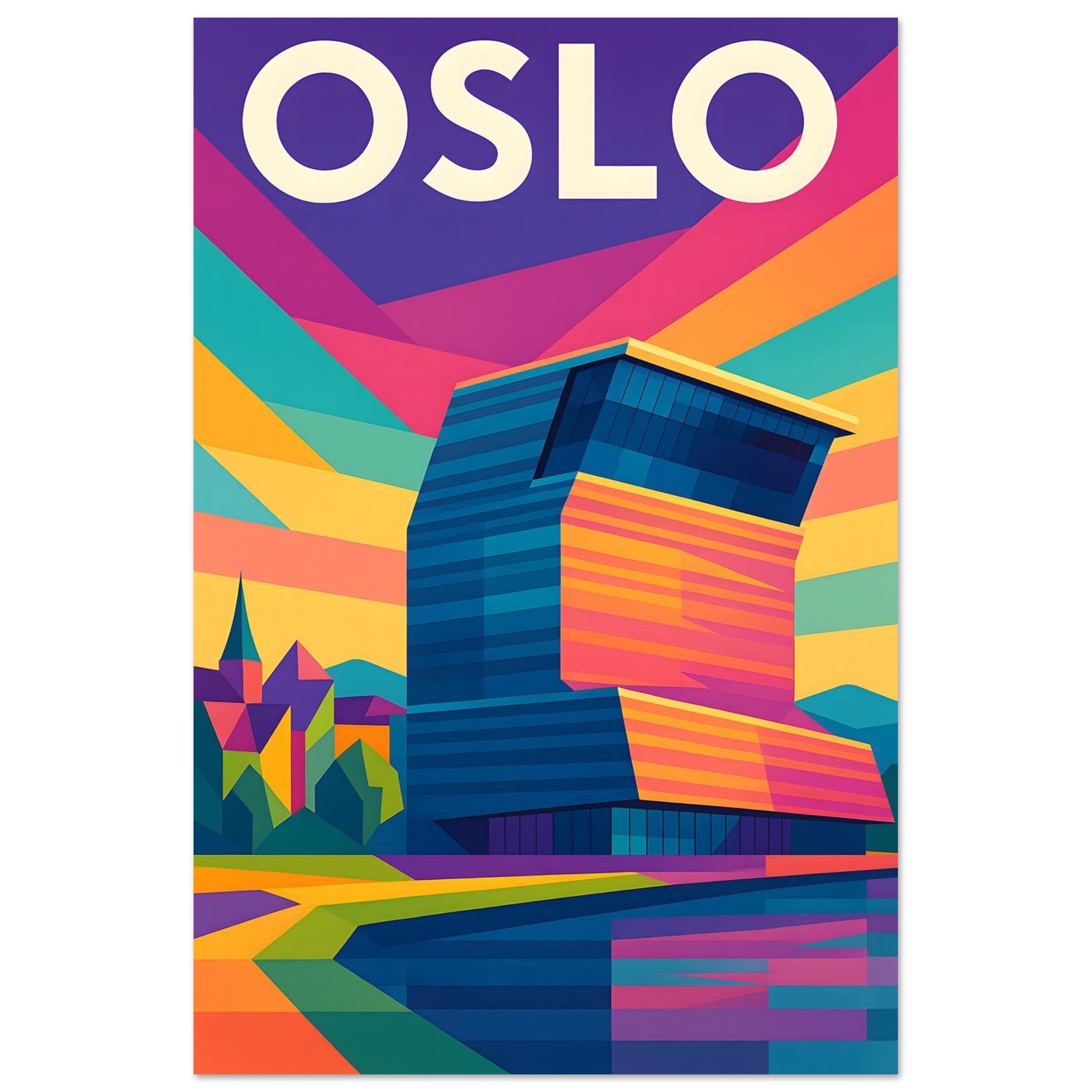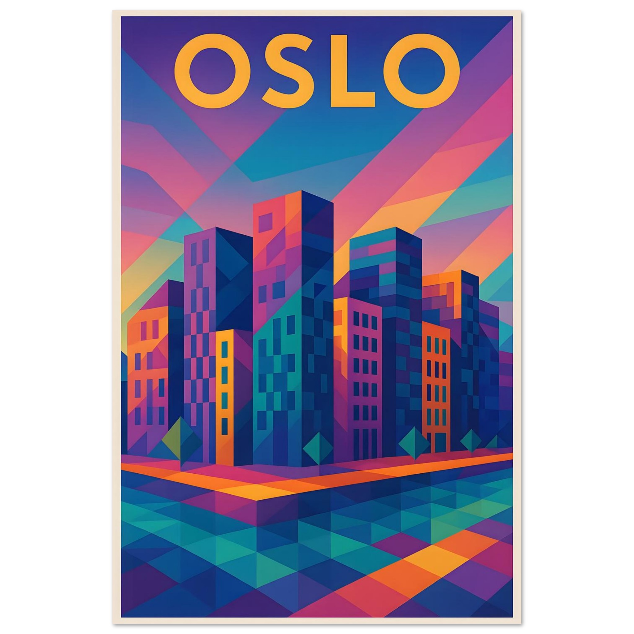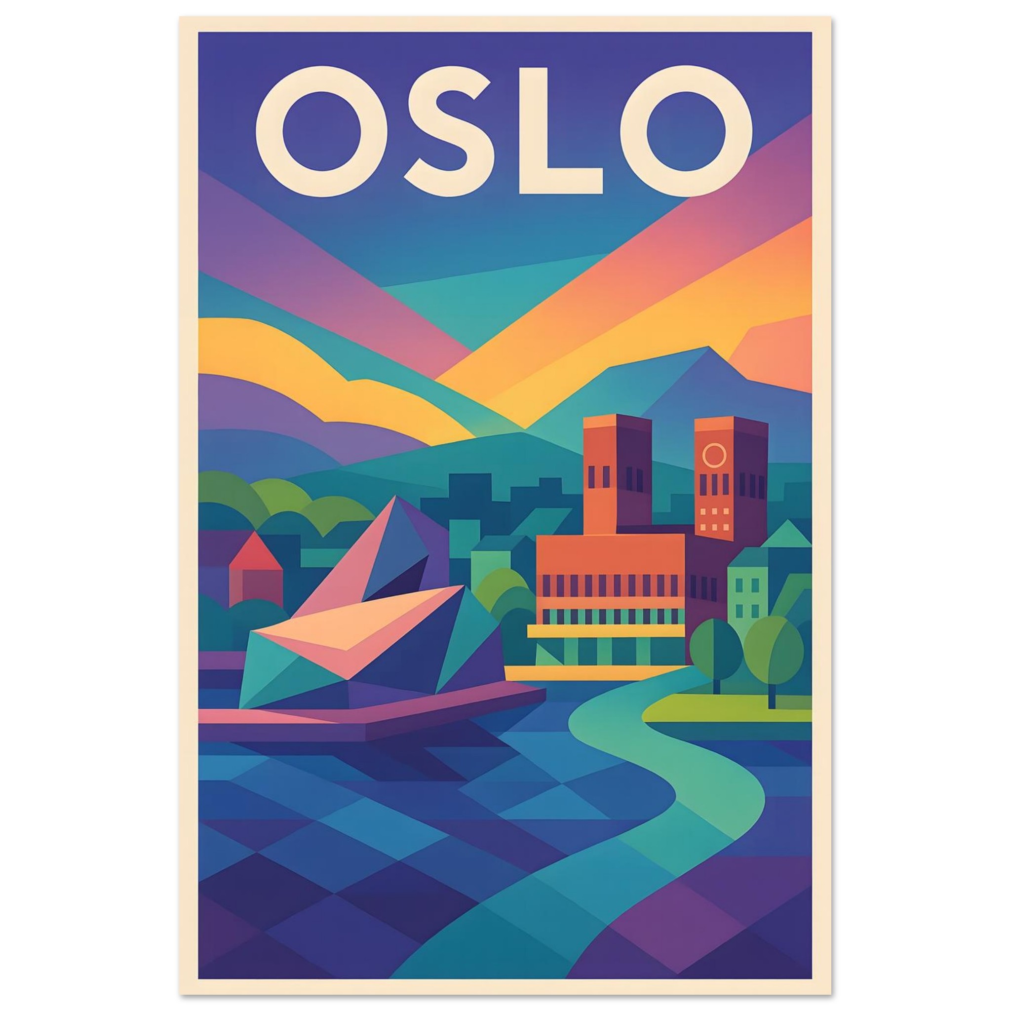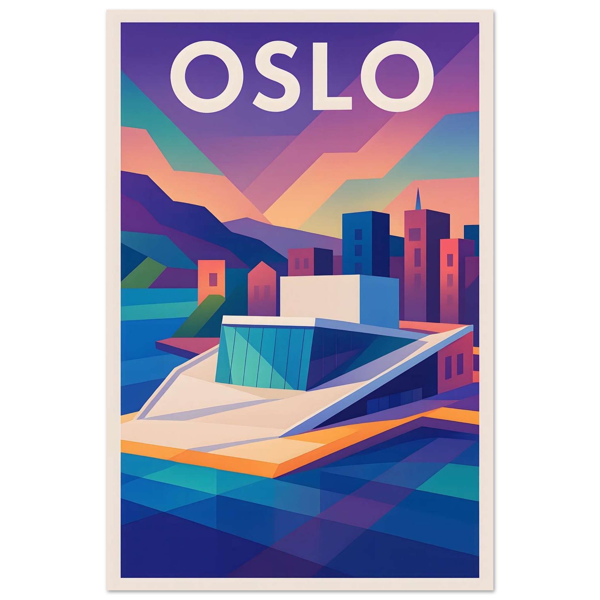 A colorful geometric vector-style illustration of Oslo. Experience art that feels silky to the touch with our high-quality, lighter-weight, classic semi-glossy paper: