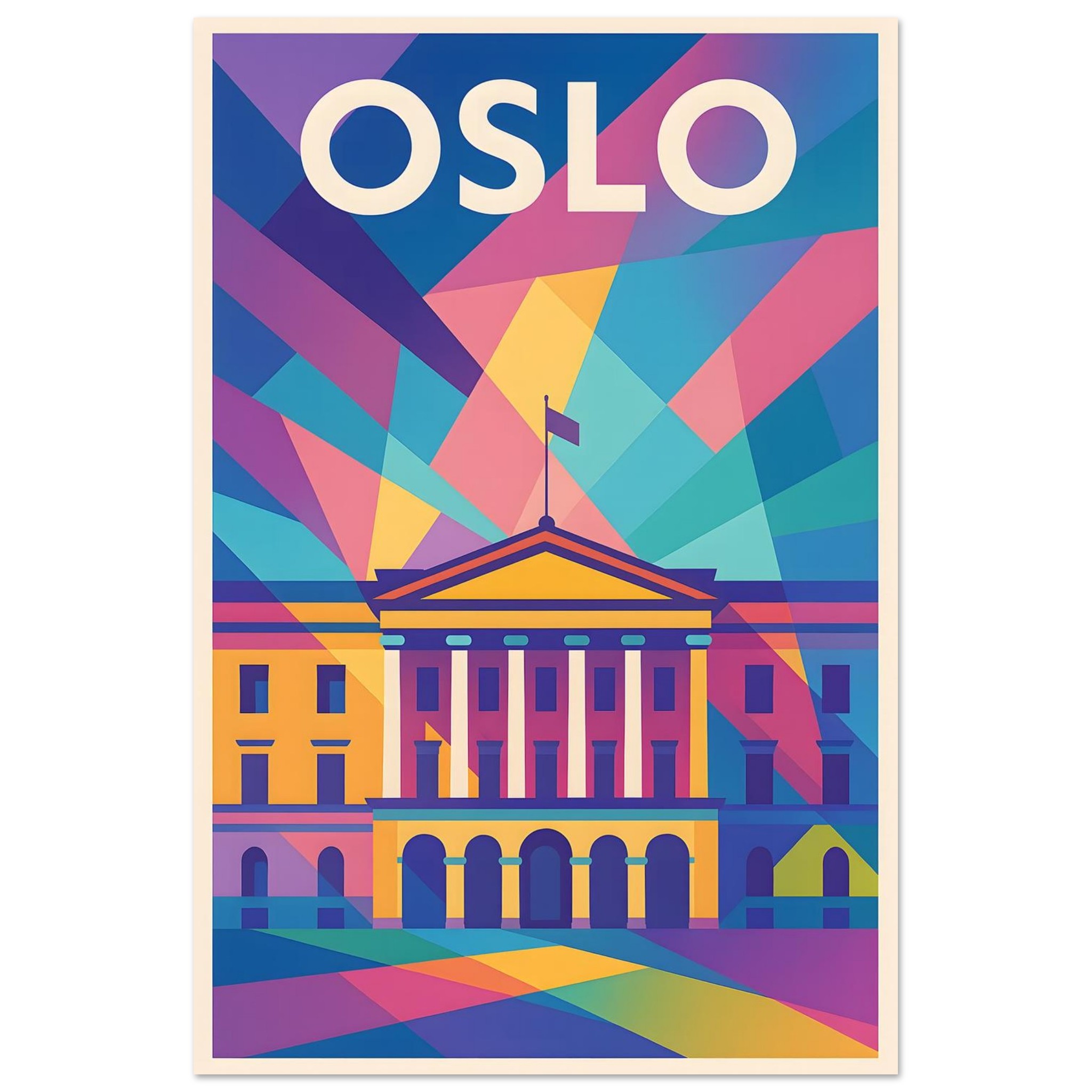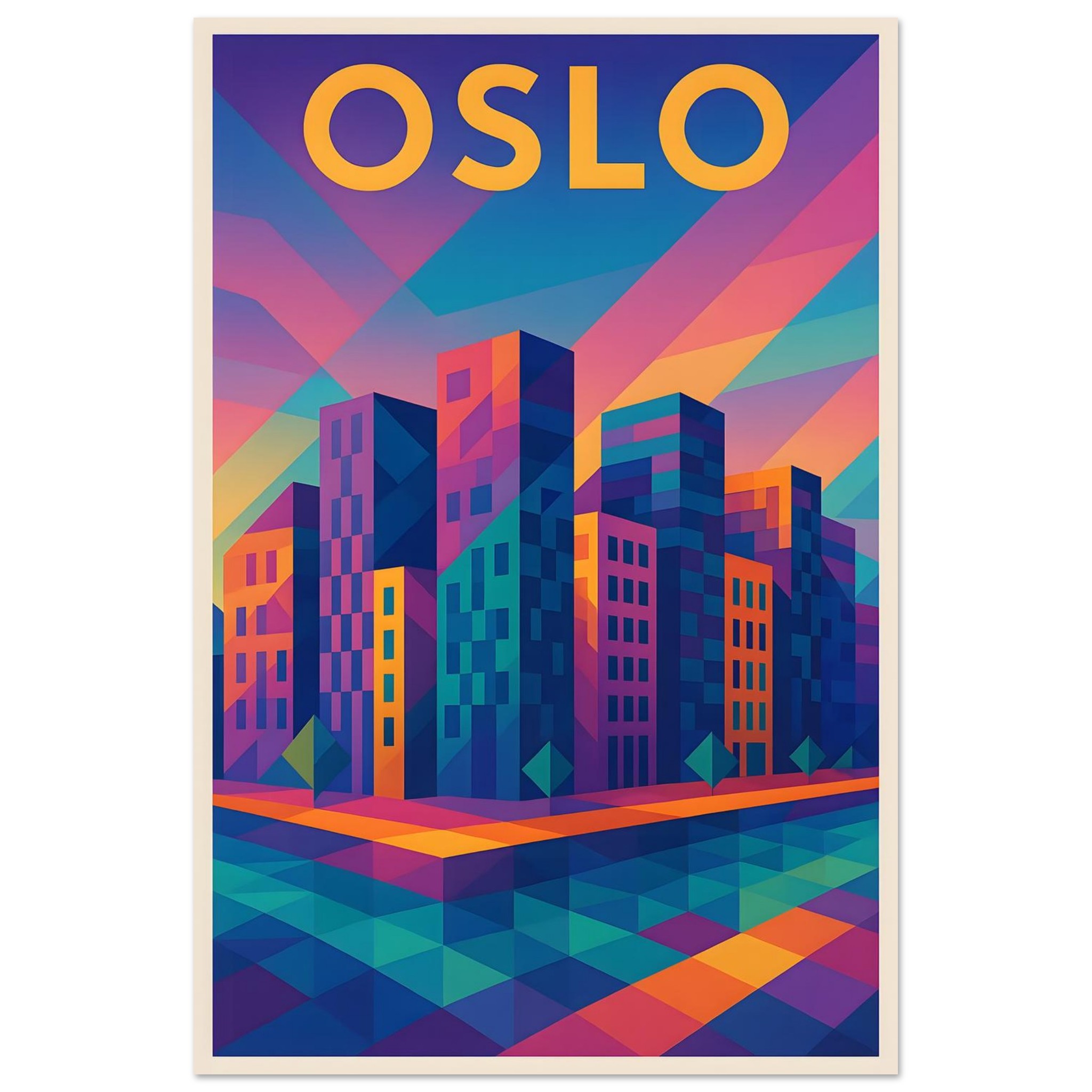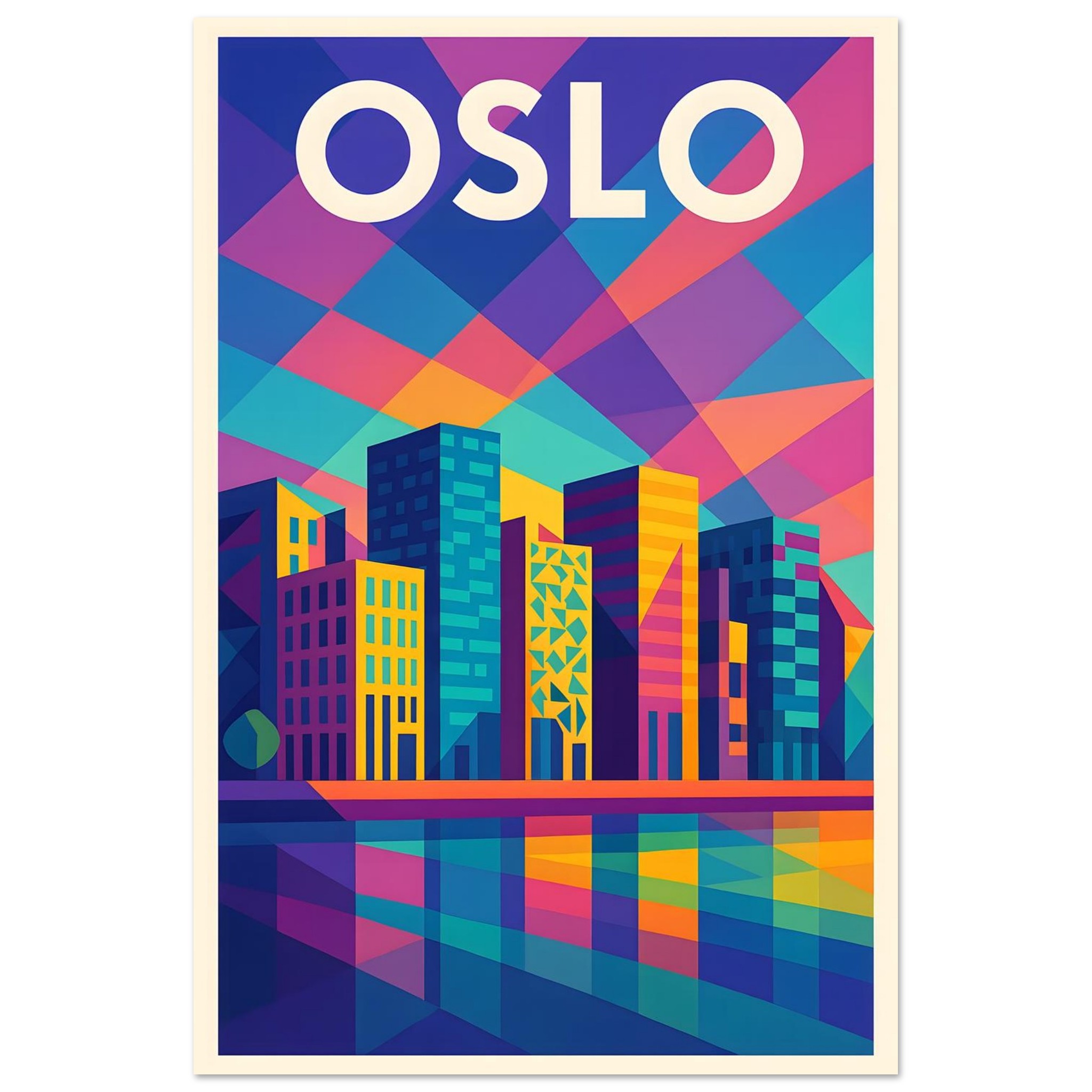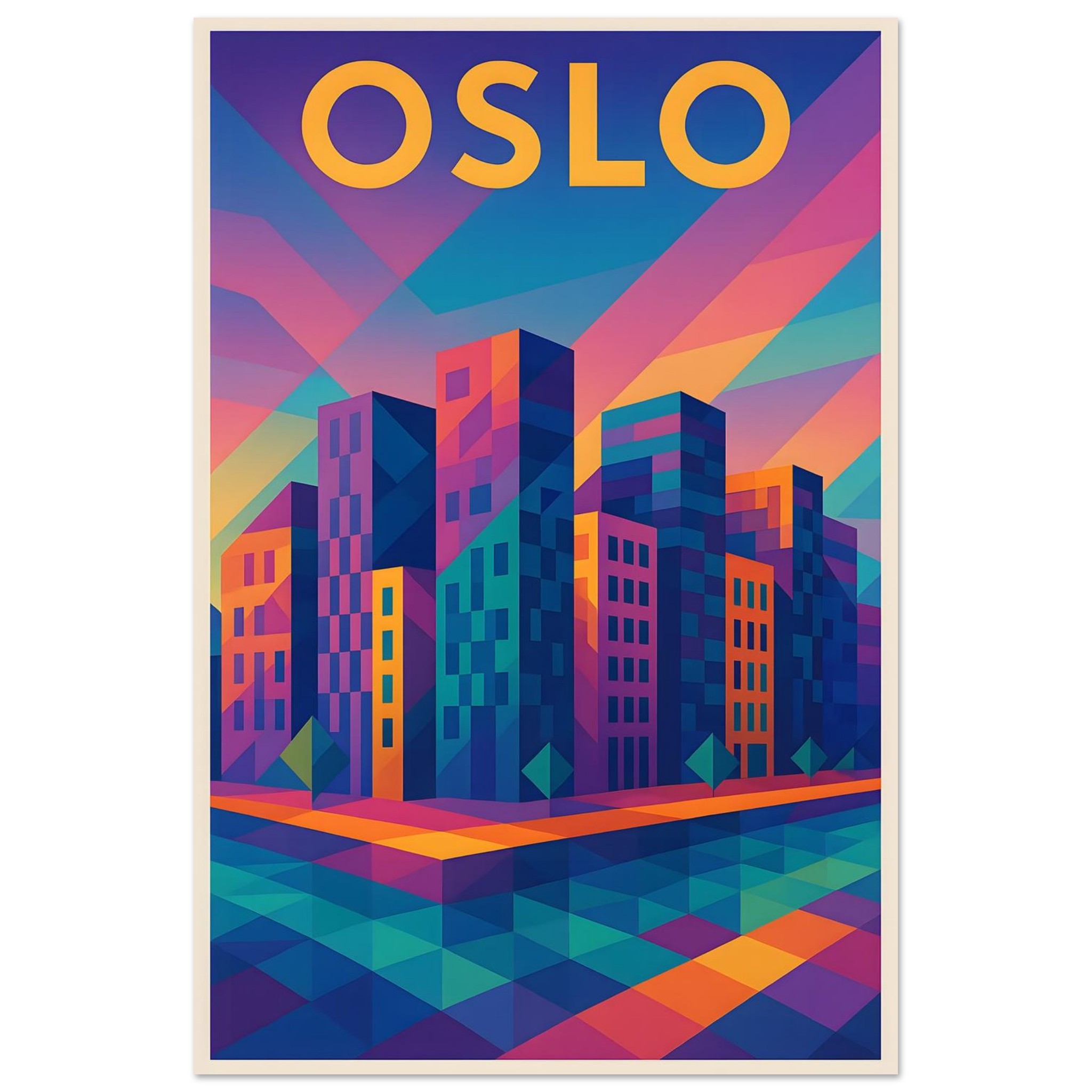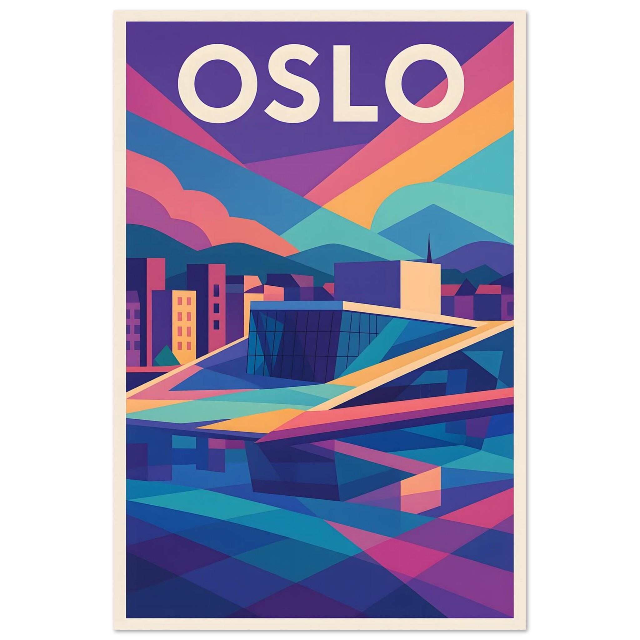 A colorful geometric vector-style illustration of Oslo. Experience art that feels silky to the touch with our high-quality, lighter-weight, classic semi-glossy paper: