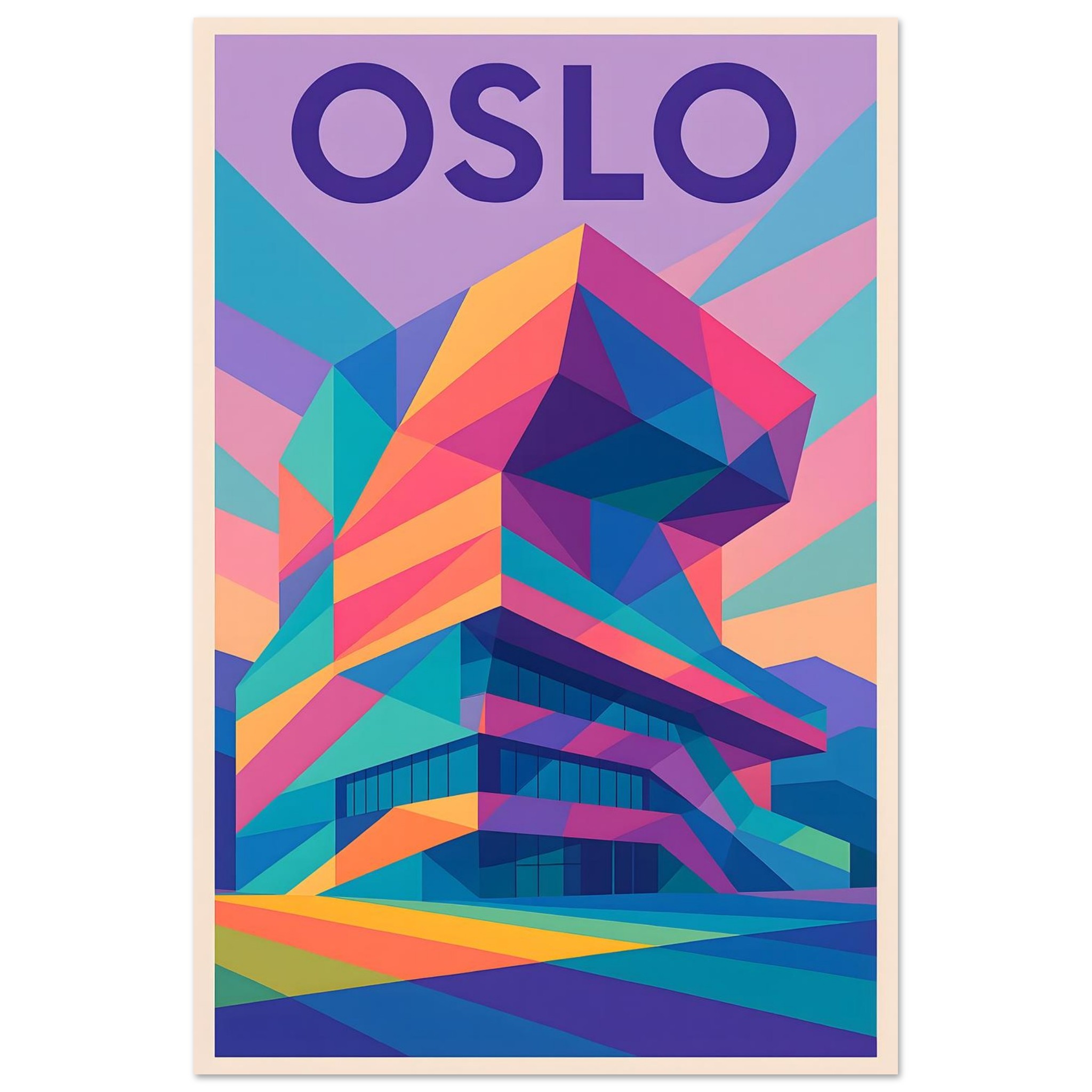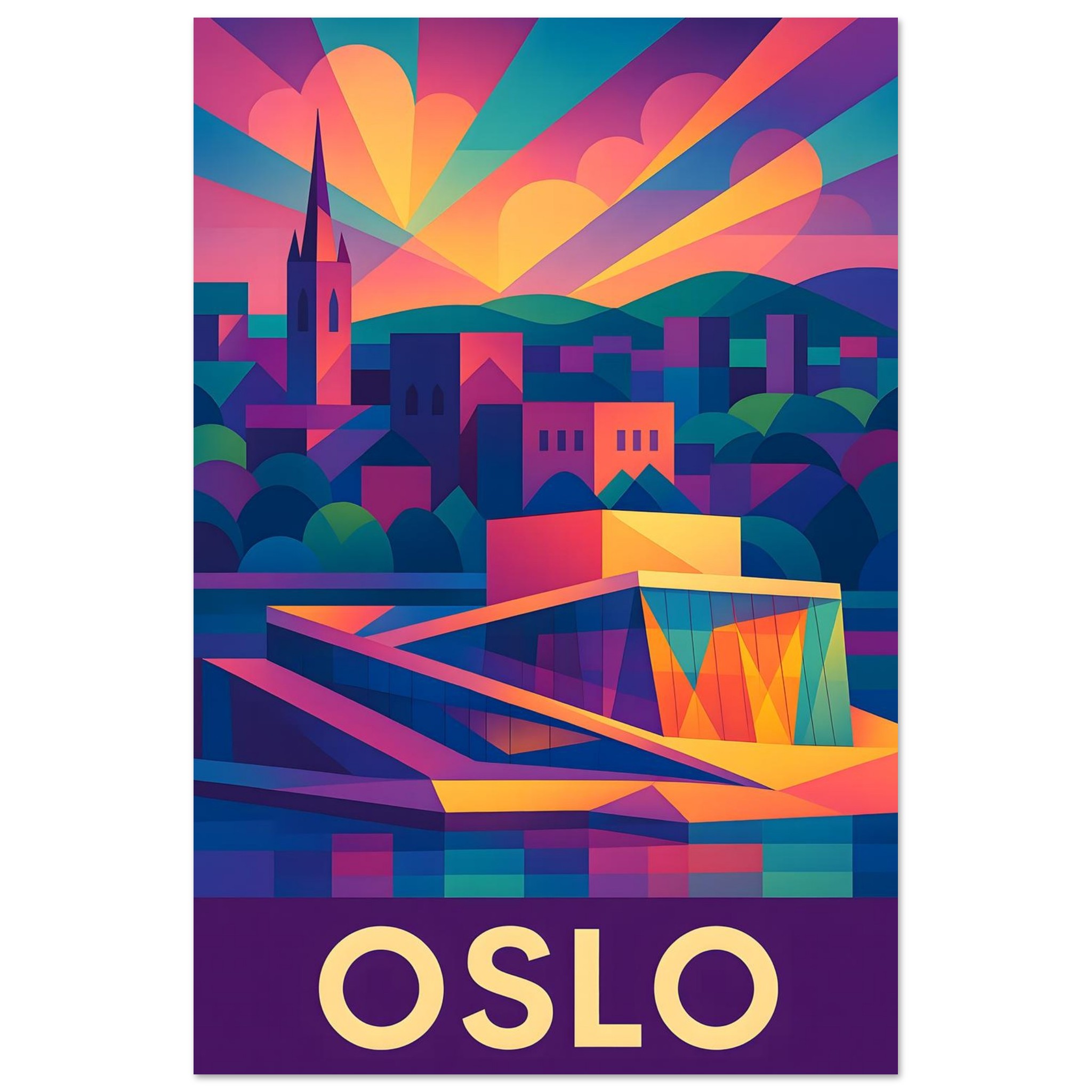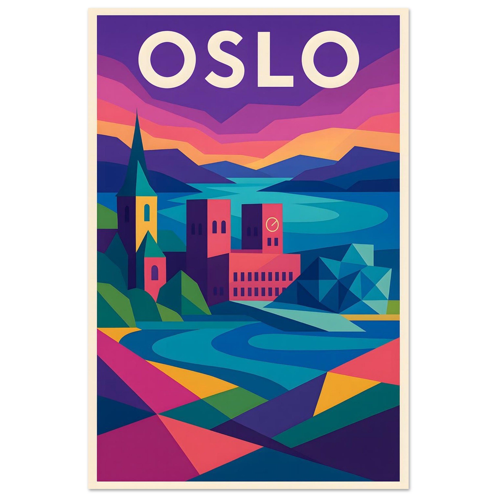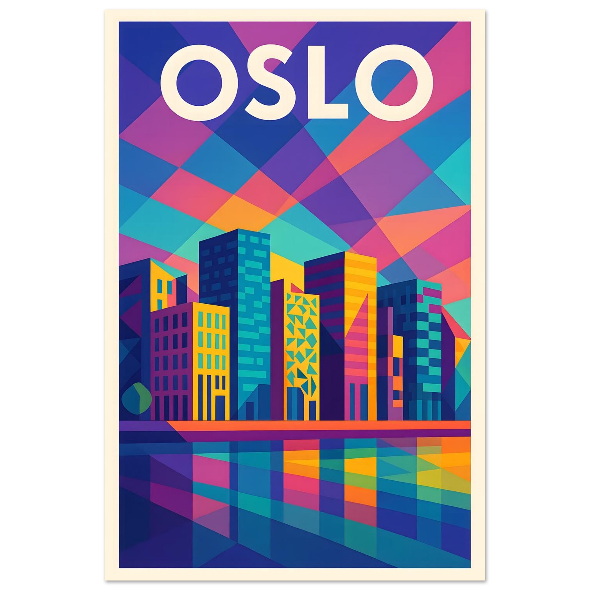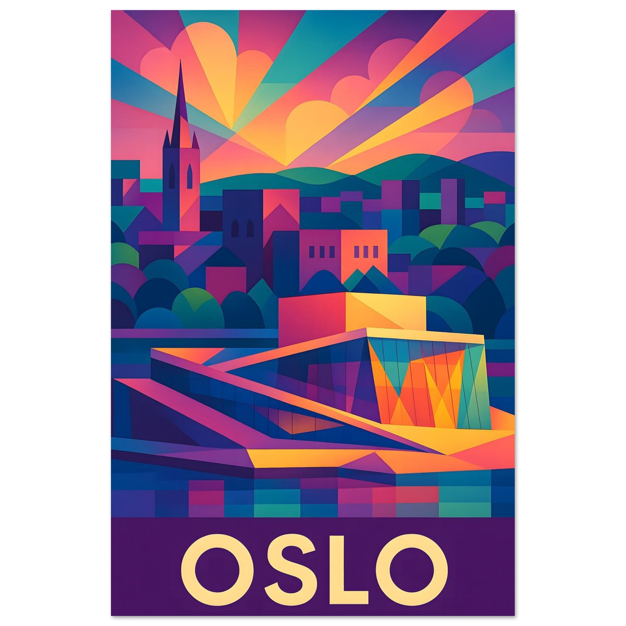 A colorful geometric vector-style illustration of Oslo. Experience art that feels silky to the touch with our high-quality, lighter-weight, classic semi-glossy paper: