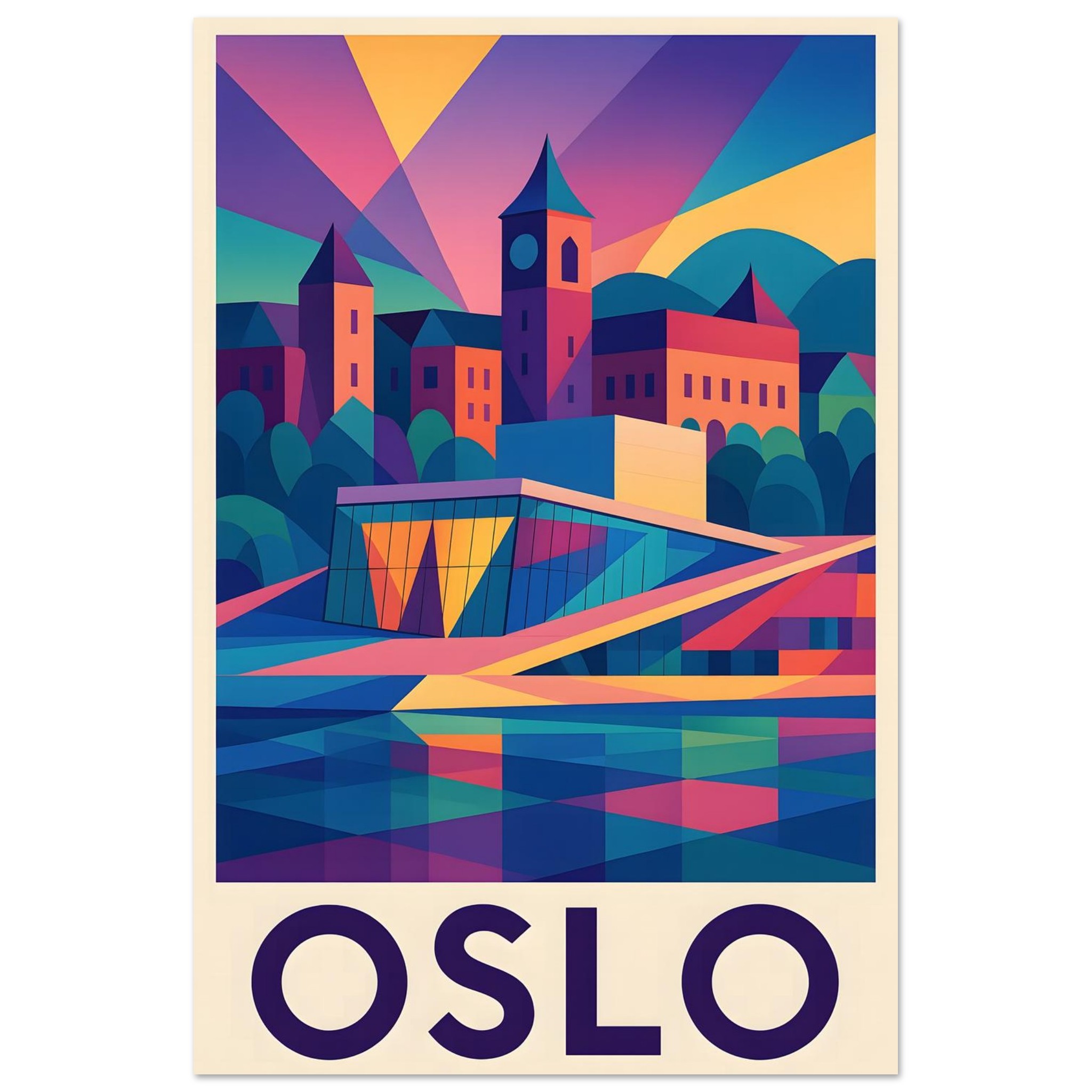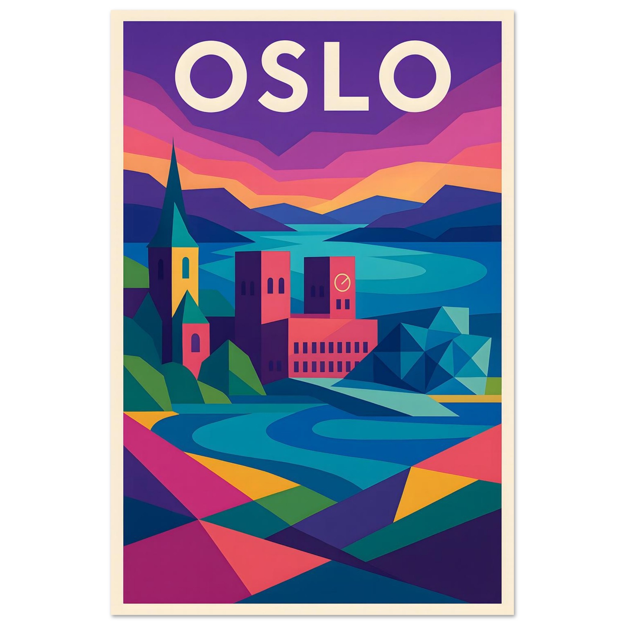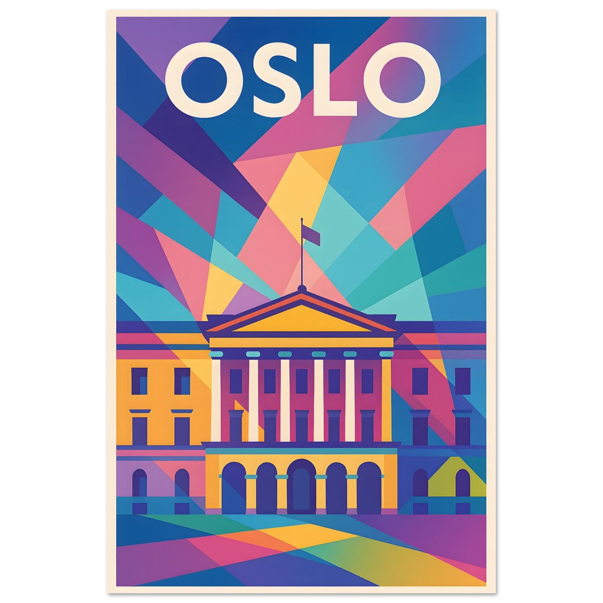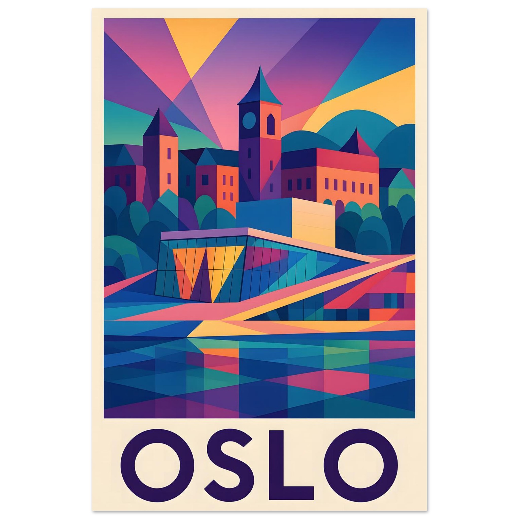 A colorful geometric vector-style illustration of Oslo. Experience art that feels silky to the touch with our high-quality, lighter-weight, classic semi-glossy paper: