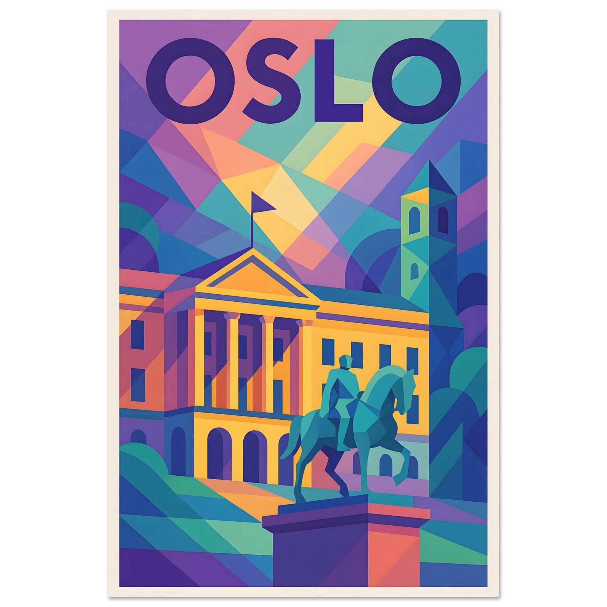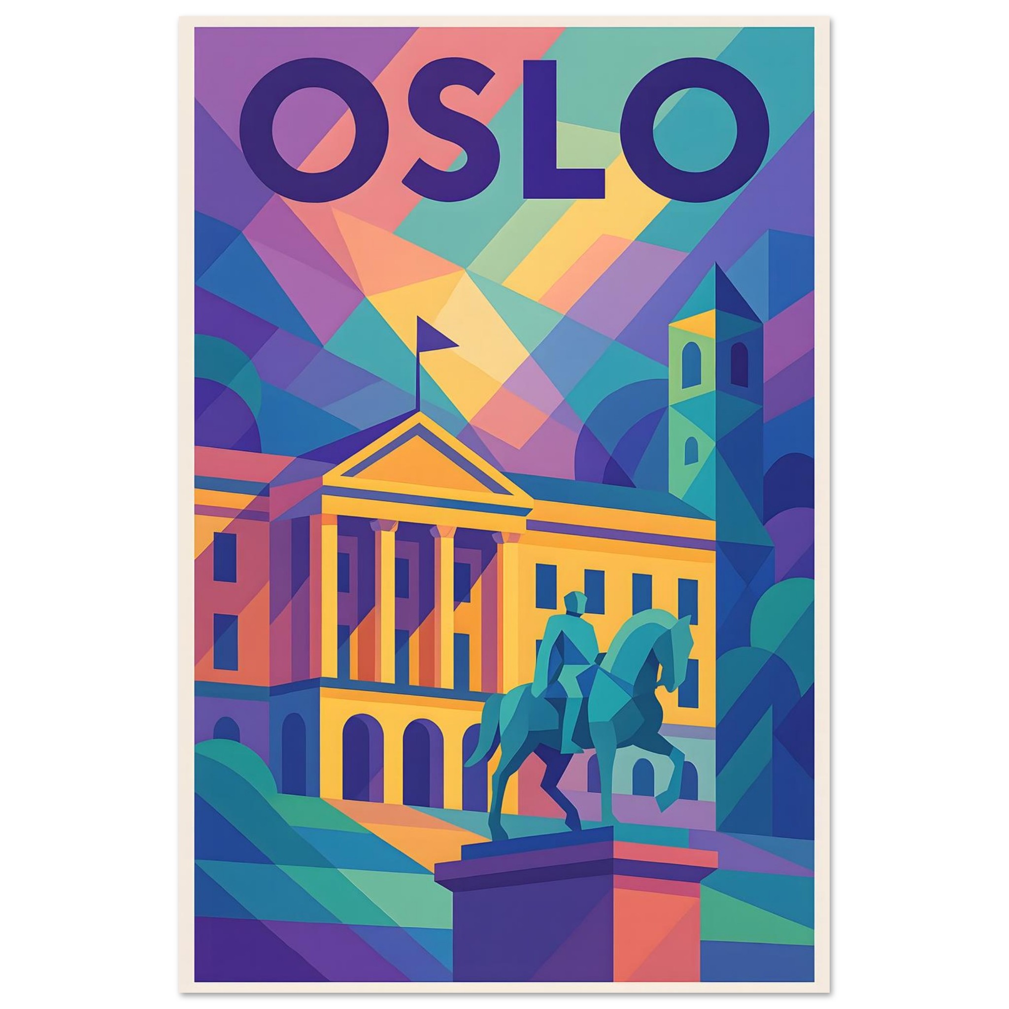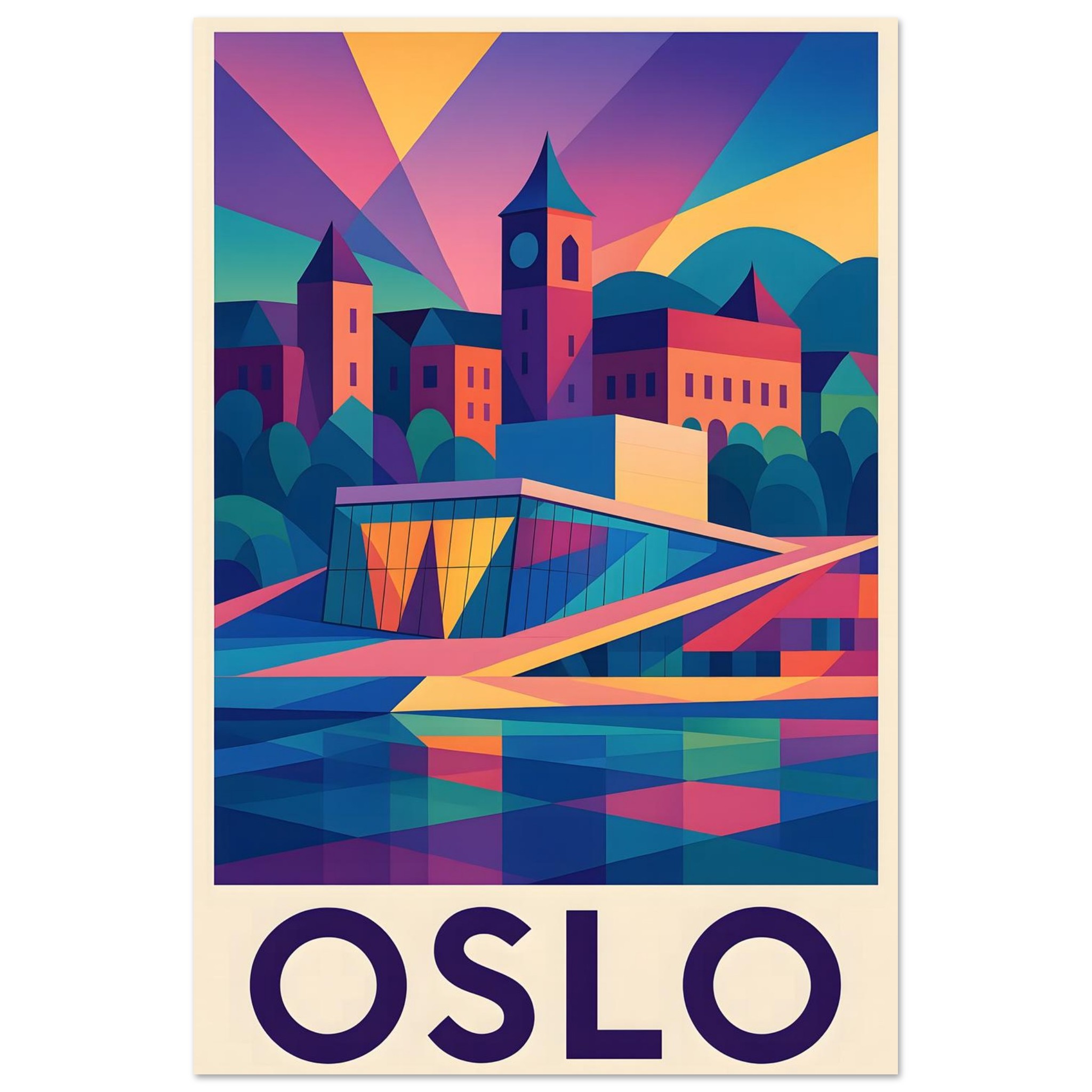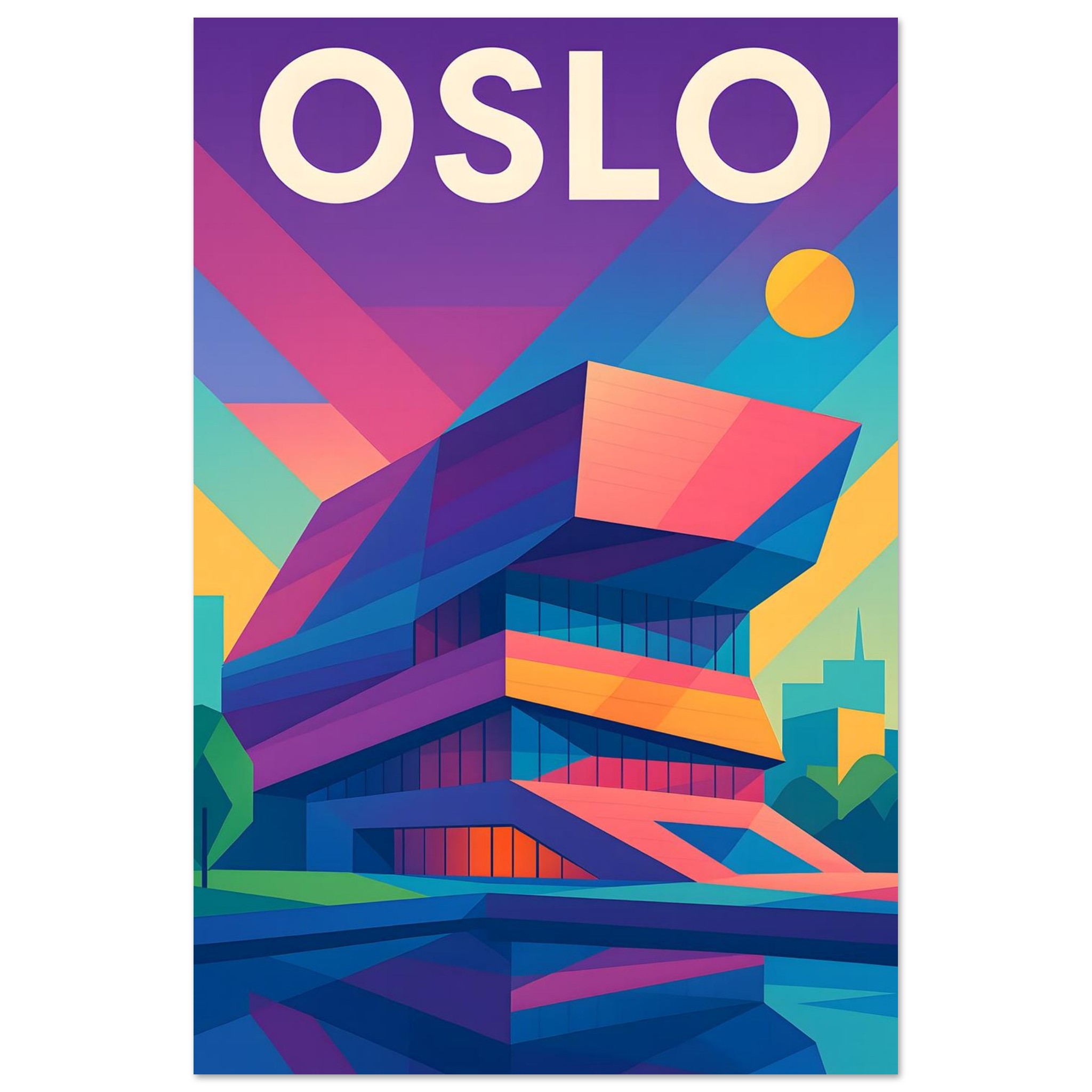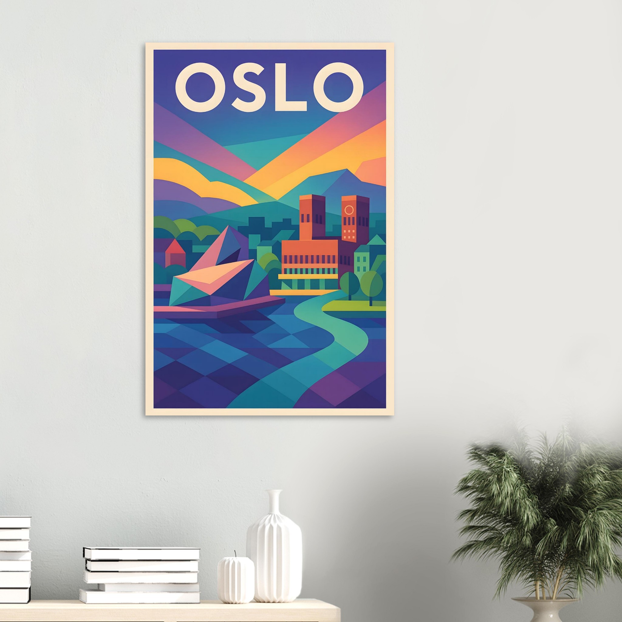 A colorful geometric vector-style illustration of Oslo. Experience art that feels silky to the touch with our high-quality, lighter-weight, classic semi-glossy paper: