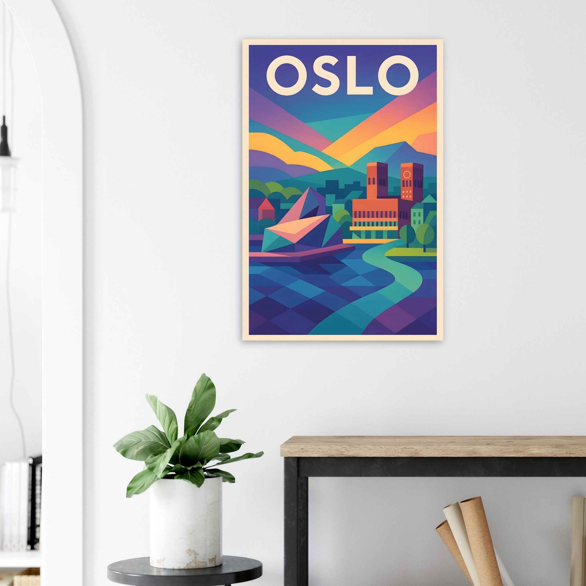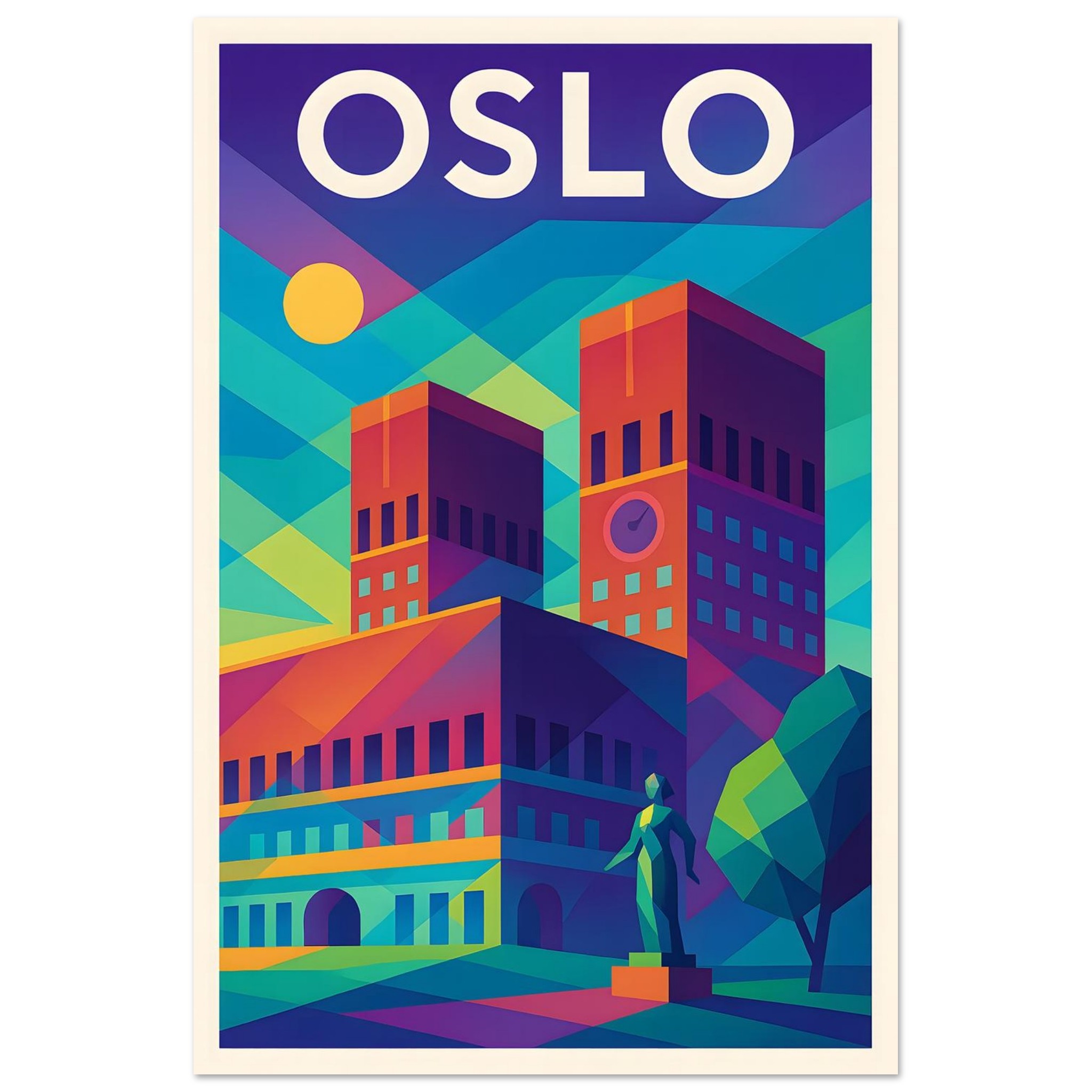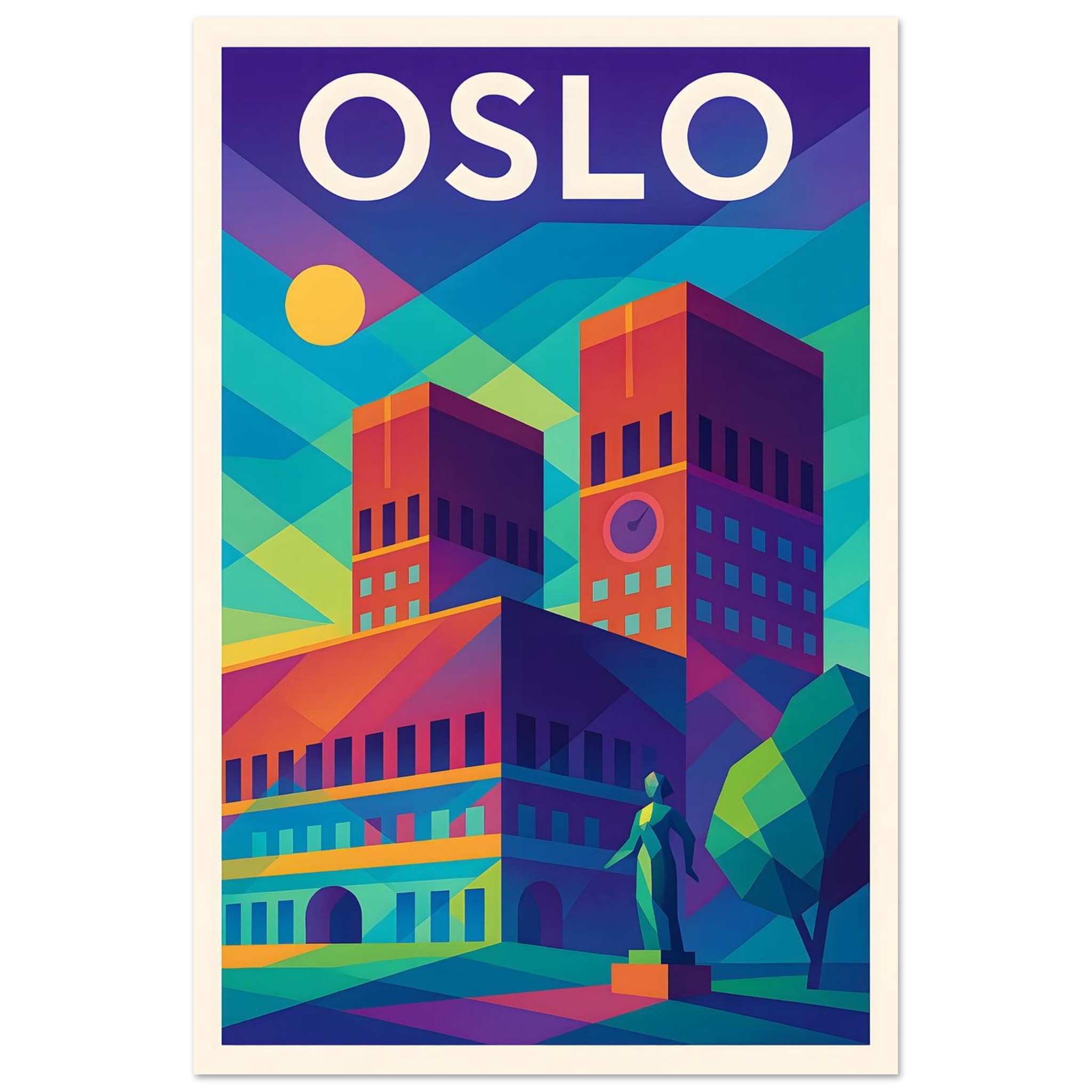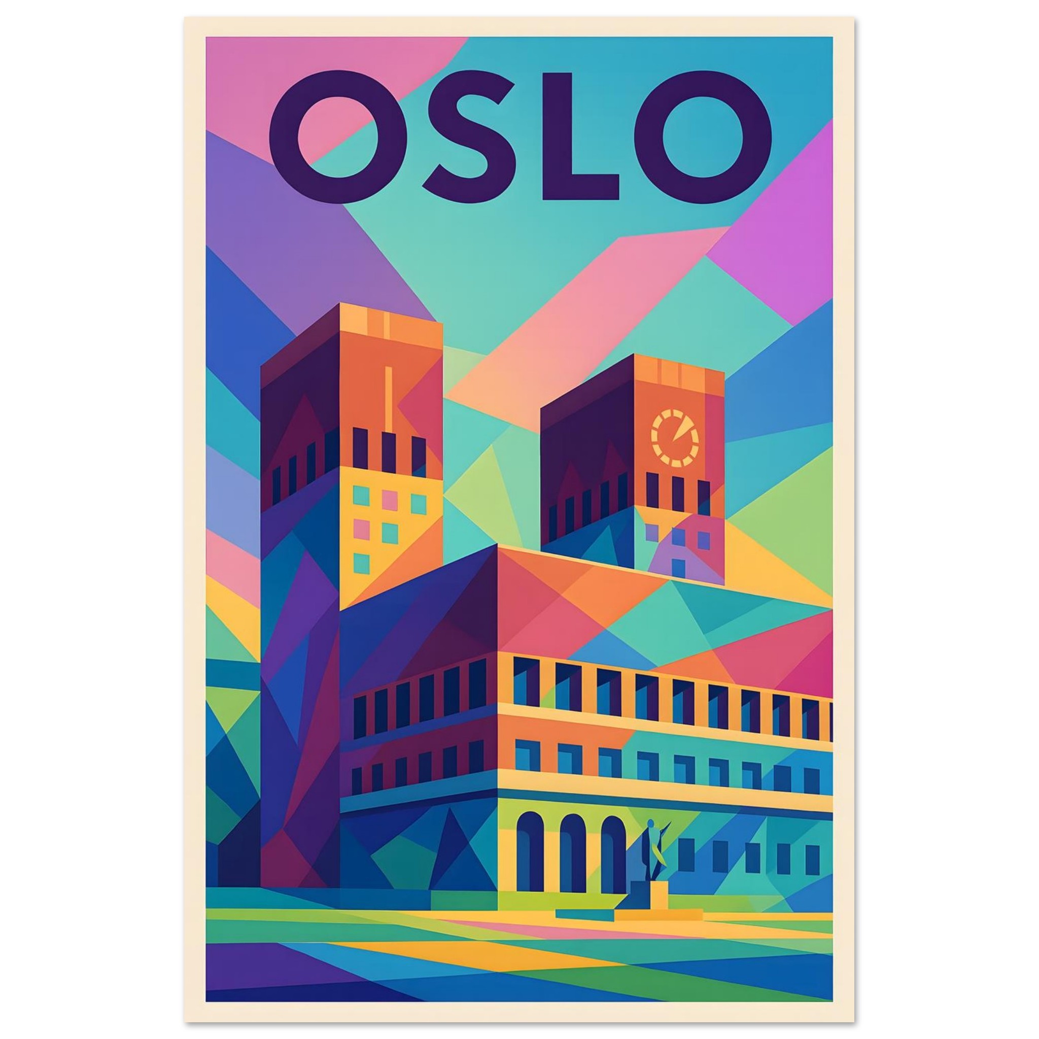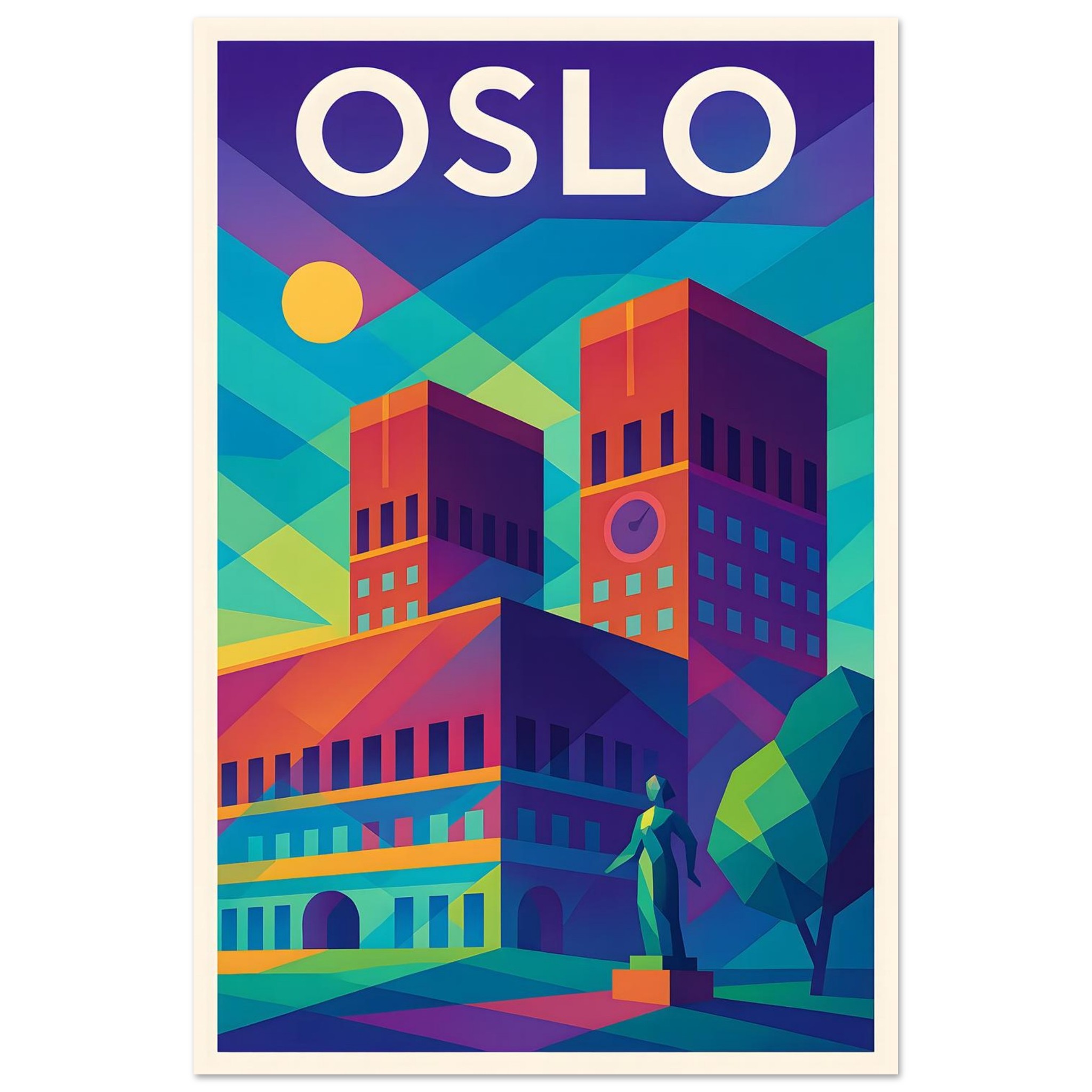 A colorful geometric vector-style illustration of Oslo. Experience art that feels silky to the touch with our high-quality, lighter-weight, classic semi-glossy paper: