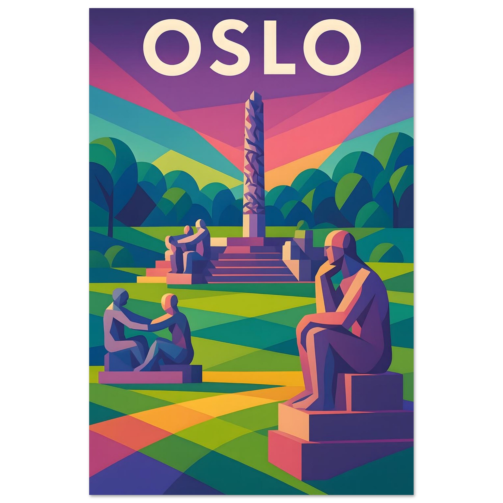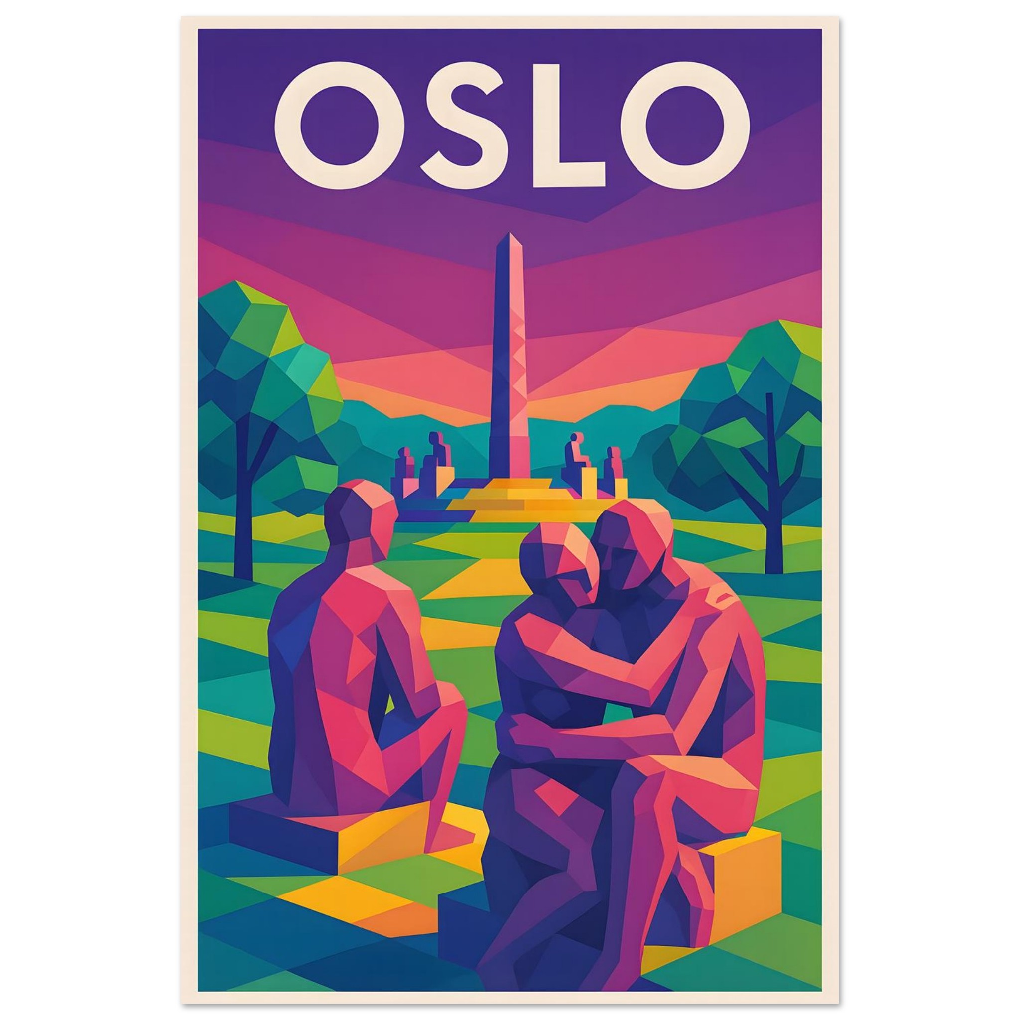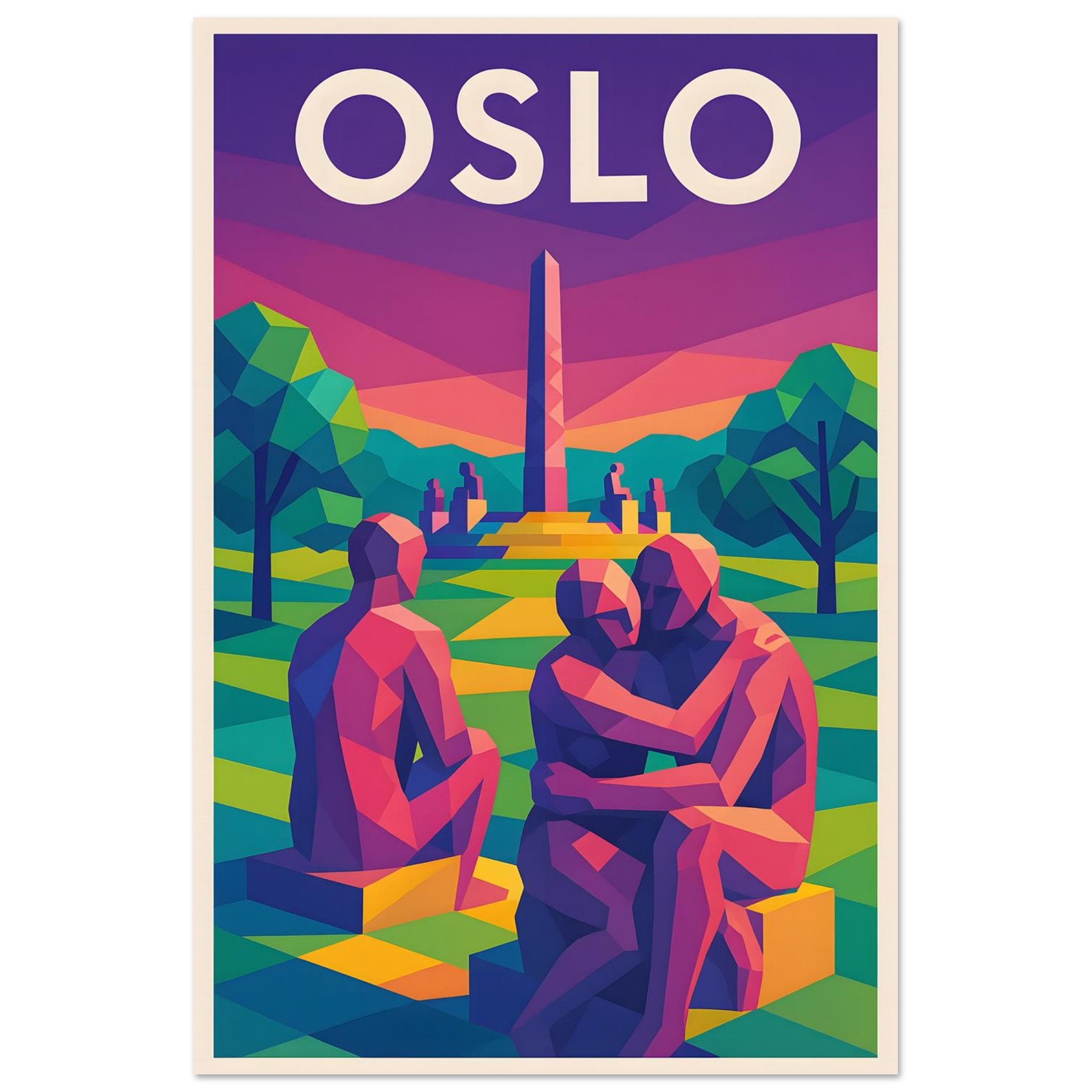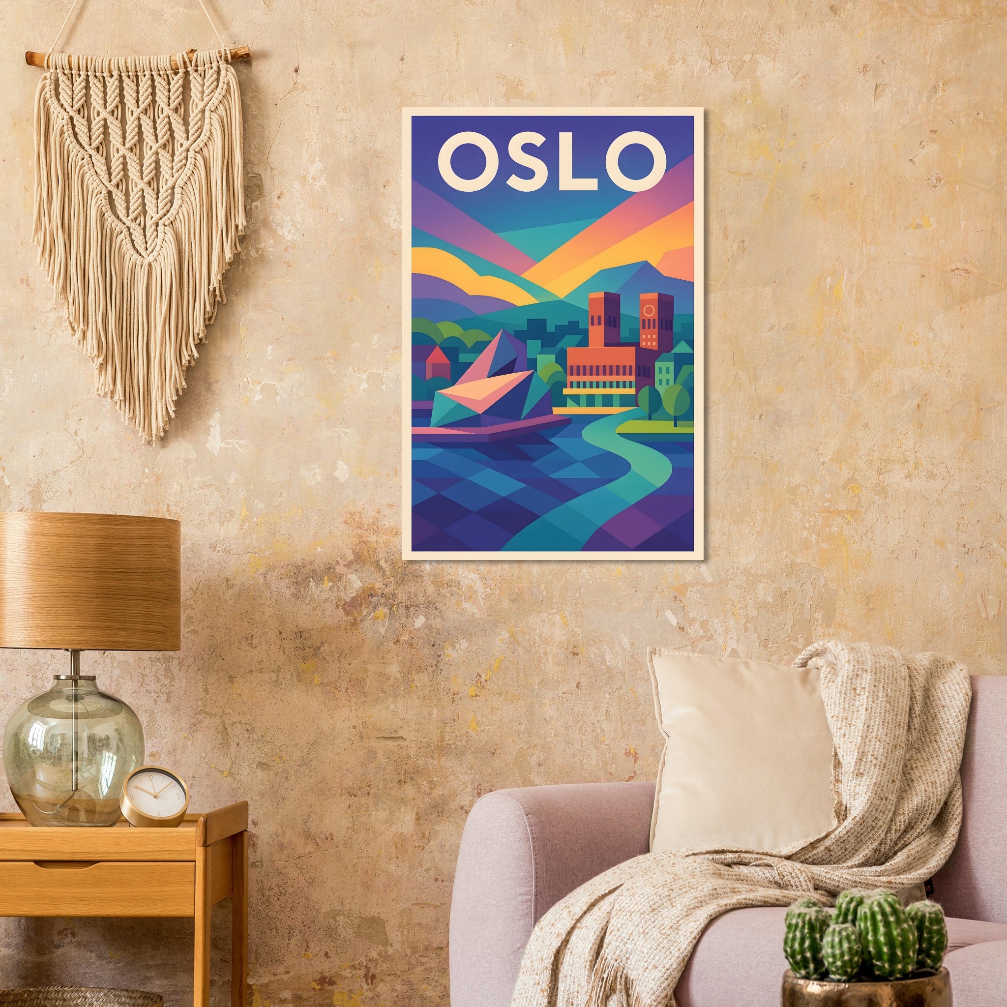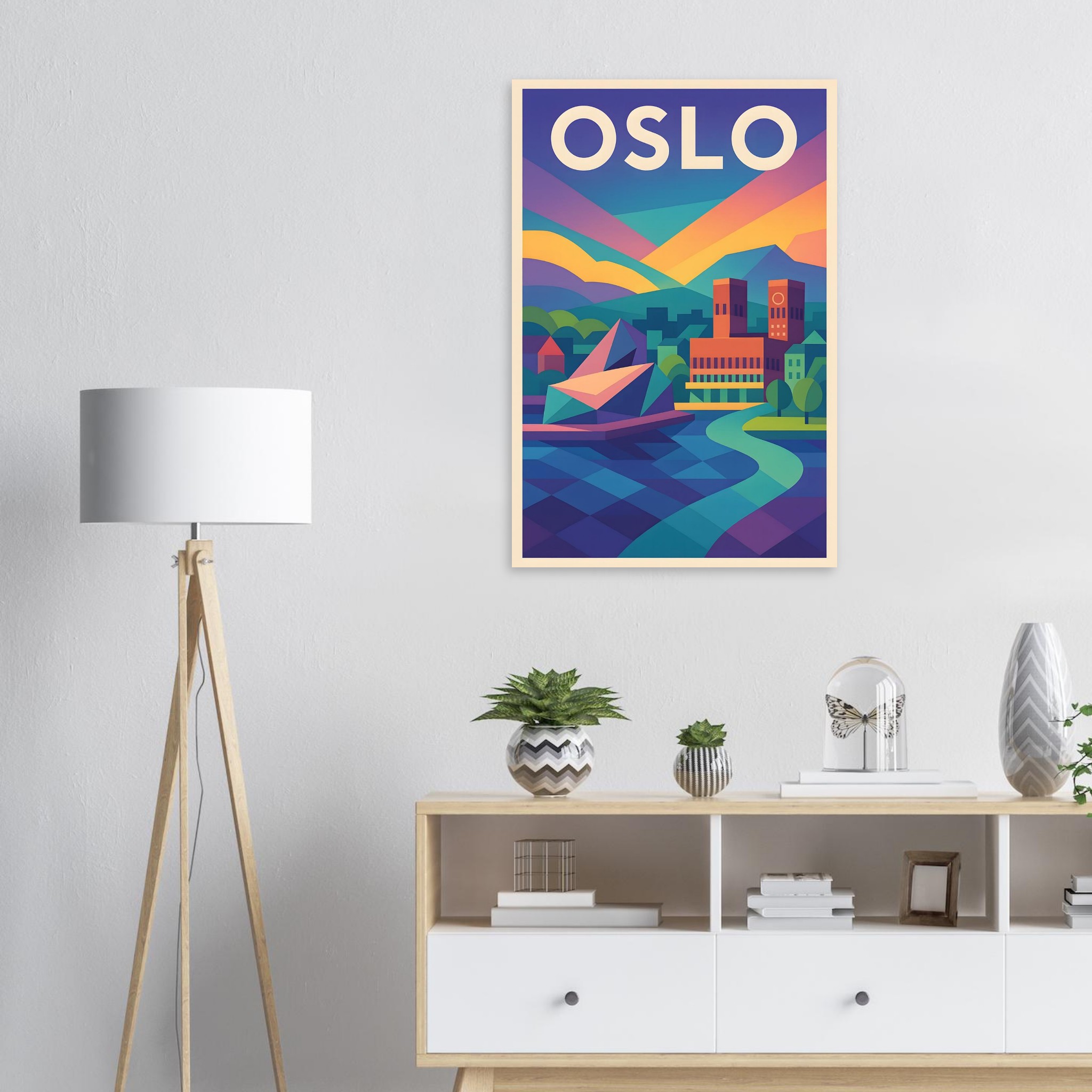 A colorful geometric vector-style illustration of Oslo. Experience art that feels silky to the touch with our high-quality, lighter-weight, classic semi-glossy paper: